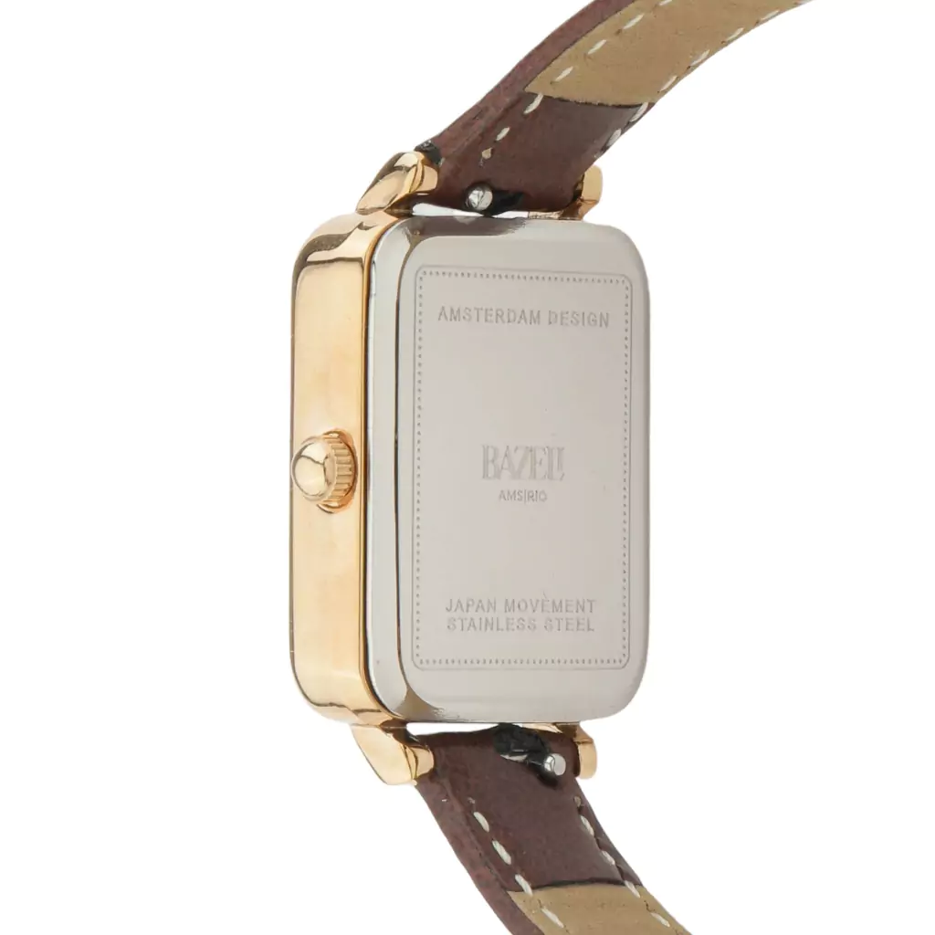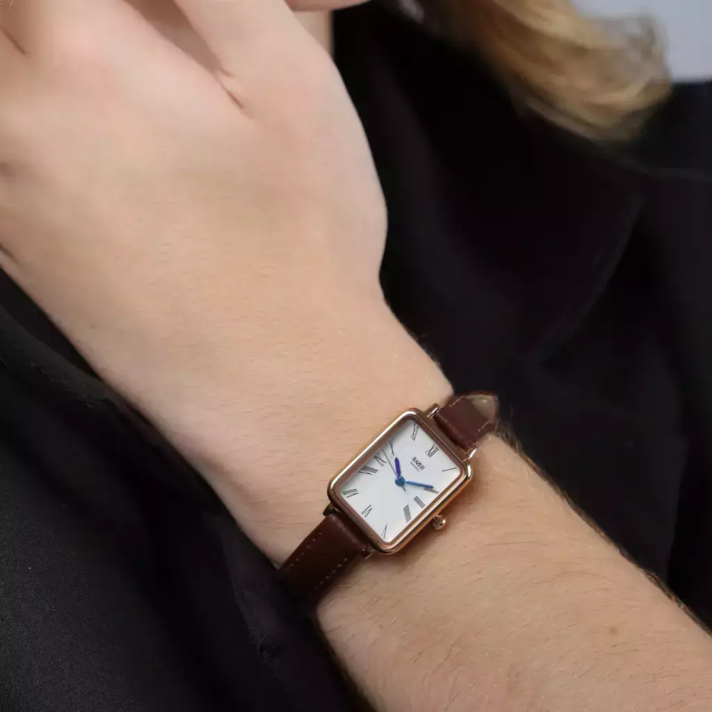 Inspirado no mestre holandês Vermeer, este relógio une delicadeza artística à precisão europeia. A caixa rosé gold de 26 mm brilha com sofisticação, enquanto o mostrador branco com algarismos romanos evoca charme clássico. Ponteiros azuis adicionam um toque contemporâneo, e a pulseira de couro marrom sintético — macia e intercambiável — garante conforto total.